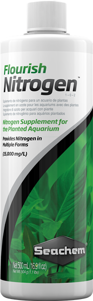 Loading... Please wait...Nitrogen is one of the main three macro nutrients (nitrogen, phosphorus, potassium: NPK) required by plants and can often become the limiting factor to growth in a flourishing system. Flourish Nitrogen™ is a concentrated (15,000 mg/L) blend of nitrogen sources. It provides nitrogen in both the nitrate form and the plant–preferred ammonium form. However, no free ammonia is released because the ammonium in Flourish Nitrogen™ is complexed and unavailable until utilized by the plants. Ammonium becomes available after conversion of urea (carbamide). Flourish Nitrogen™ also provides nitrate for those plants that can readily utilize nitrate as well. For maximum benefit, use with Flourish Phosphorus™ and Flourish Potassium™. Flourish Nitrogen™ is safe for invertebrates such as shrimp.
