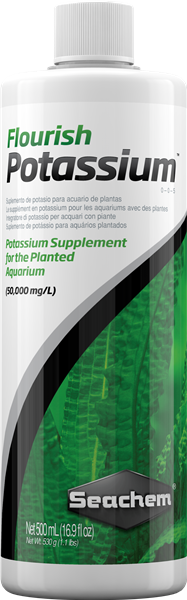Loading... Please wait...Flourish Potassium™ contains 50,000 mg/L of potassium suitable for the natural planted aquarium. Potassium is one of several elements that are vitally important to maintaining a vigorous level of growth in a planted aquarium. Potassium can become depleted in a rapidly growing system or when the source water has a low mineral content. In these cases potassium could become the limiting factor to growth. Use Flourish Potassium™ to prevent potassium depletion (signs of which include yellowing in older leaves) and maintain the highest level of growth.
