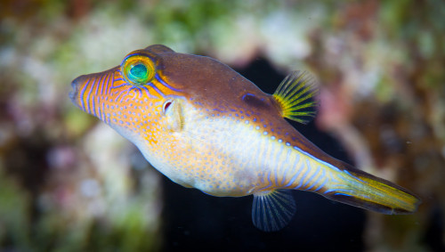 Loading... Please wait...The Sharpnose Puffer (Canthigaster rostrata) can be found among the Caribbean and further south, towards Venezuela. C. rostrata have a brown dorsal section with a white underbelly and blue stripes near their caudal fin. They can be found singly or in pairs among seaward reefs, where they search for crustaceans and other invertebrates. They are considered reef safe, but should not be kept with prized invertebrates, such as Venus shrimp or Pom-Pom Crabs. They require an omnivorous diet, consisting of crustaceans and other meaty preparations, as well as occasional seaweed or macro-algae. They reach a maximum size of 4 inches and are rather peaceful towards other tankmates.